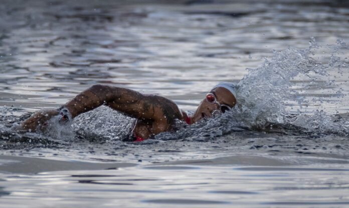 A brasileira Ana Marcela Cunha (na ponta direita) faz terceiro melhor tempo na etapa de Soma Bay (Egito), que serve de preparação para Mundial em julho, no Japão – Reprodução Twitter/World Aquatics