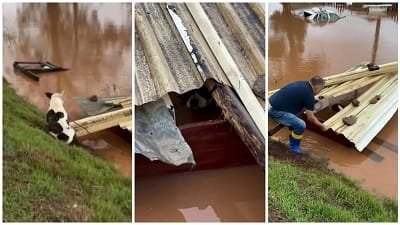 Um dos cães estava sob o gramado, preso, por uma coleira, ao que aparentava ter sido, um dia, uma casinha de cachorro. A cena, que foi registrada na Região das Ilhas, na Grande Porto Alegre, foi narrada pelo repórter Eduardo Pinzon. “Pessoal, aqui está o motivo para nunca deixar os animais de estimação presos na coleira. A água atingiu a casinha do animal e ele está preso aqui. A gente vai tentar soltar ele agora”, diz o jornalista.